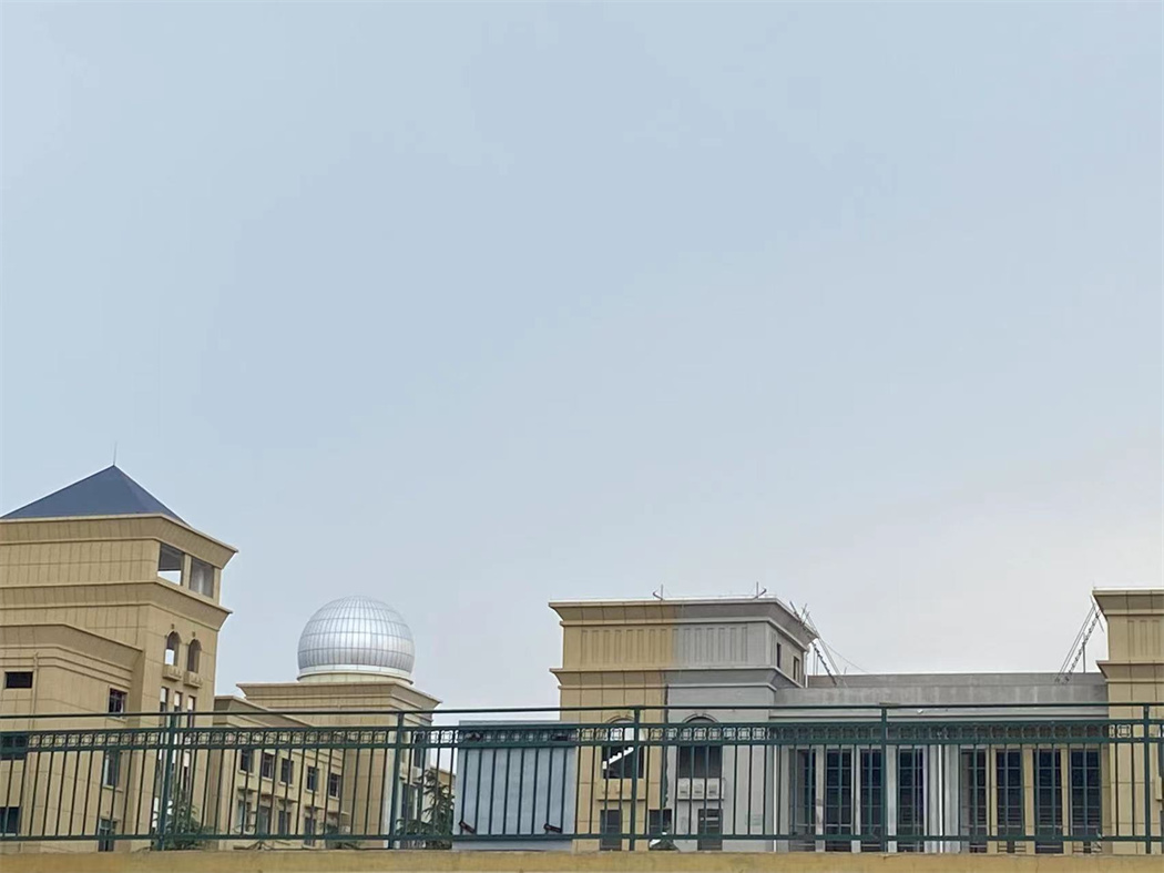 淮北中學(xué)天文臺,在樓頂搭建一座2.5米高房子,雙層結(jié)構(gòu),外板采用鋁塑板,內(nèi)板采用微孔鋁板,中間有吸音棉,一樓鋪設(shè)地磚,二樓鋼結(jié)構(gòu),鋼平臺大梁小梁采用矩形管,定制望遠(yuǎn)鏡基座,用于后期放置望遠(yuǎn)鏡用,制作順墻弧形鋼梯,扶手采用市場專用扶手,美觀、牢固。上層配備9米經(jīng)典式天文圓頂,外殼光滑,具備抗腐蝕,防銹,密封防塵好,不漏雨,也是天文觀測的標(biāo)志性建筑,經(jīng)典型天文圓頂古典美麗,是大眾認(rèn)知度很高的一種天文建筑。